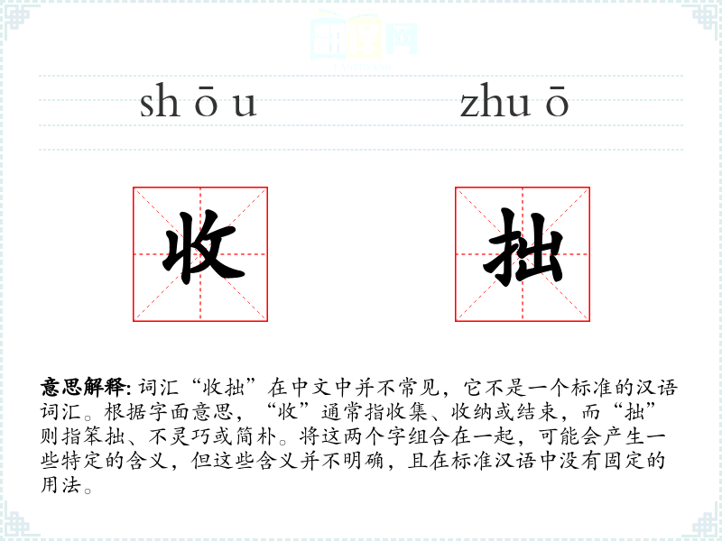 同义词与反义词: 由于“收拙”不是一个标准词汇,很难找到直接的同义词和反义词。如果将其理解为谦虚或简朴,同义词可能包括“朴素”、“简陋”等,反义词可能是“华丽”、“精巧”等。