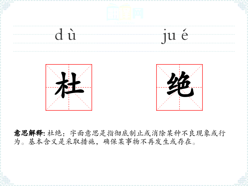 杜绝:字面意思是指彻底制止或消除某种不良现象或行为。基本含义是采取措施,确保某事物不再发生或存在。