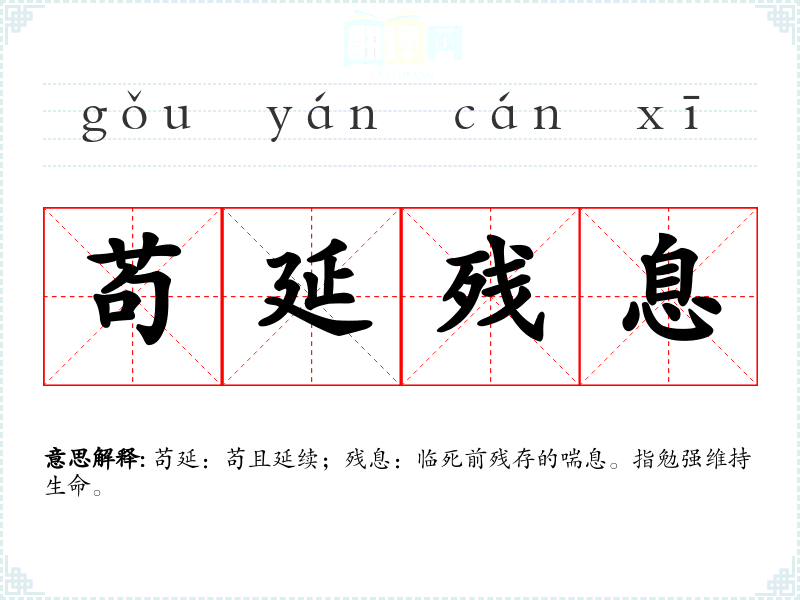苟延:苟且延续;残息:临死前残存的喘息。指勉强维持生命。