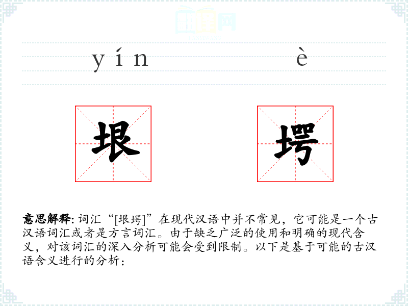 词汇“[垠堮]”在现代汉语中并不常见,它可能是一个古汉语词汇或者是方言词汇。由于缺乏广泛的使用和明确的现代含义,对该词汇的深入分析可能会受到限制。以下是基于可能的古汉语含义进行的分析: