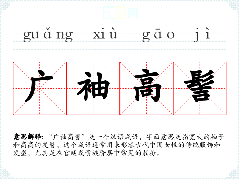 “广袖高髻”是一个汉语成语,字面意思是指宽大的袖子和高高的发髻。这个成语通常用来形容古代**女性的传统服饰和发型,尤其是在宫廷或贵族阶层中常见的装扮。