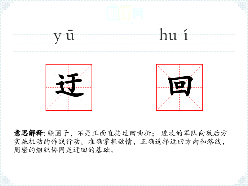 ; 进攻的军队向敌后方实施机动的作战行动。准确掌握敌情,正确选择迂回方向和路线,周密的组织协同是迂回的基础。