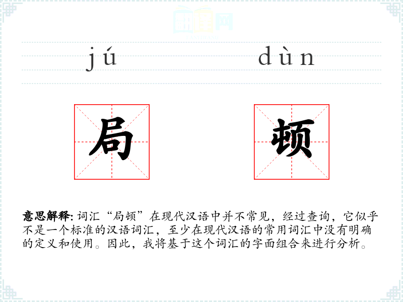 词汇“局顿”在现代汉语中并不常见,经过查询,它似乎不是一个标准的汉语词汇,至少在现代汉语的常用词汇中没有明确的定义和使用。因此,我将基于这个词汇的字面组合来进行分析。