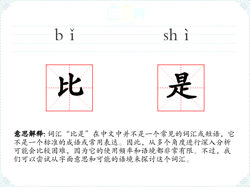 “比是”字面意思可能是“比较是”或“比作是”,但这种组合在中文中并不常见,也没有明确的定义。它可能是一个方言表达,或者是在特定语境下的非标准用法。