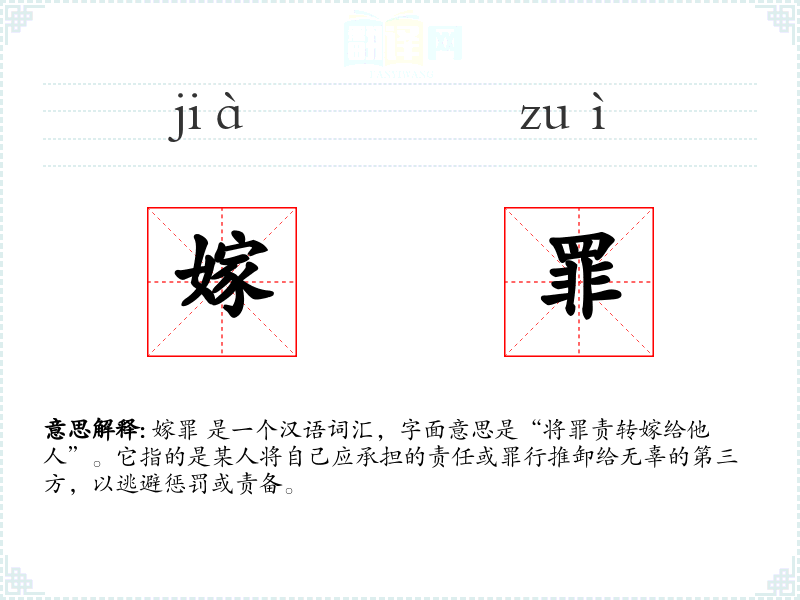 “嫁罪”一词源于汉语,其中“嫁”字原指女子出嫁,后引申为转移、转嫁之意,“罪”则指罪行或责任。这个词汇在古代文献中已有使用,随着时间的推移,其含义和用法逐渐固定。