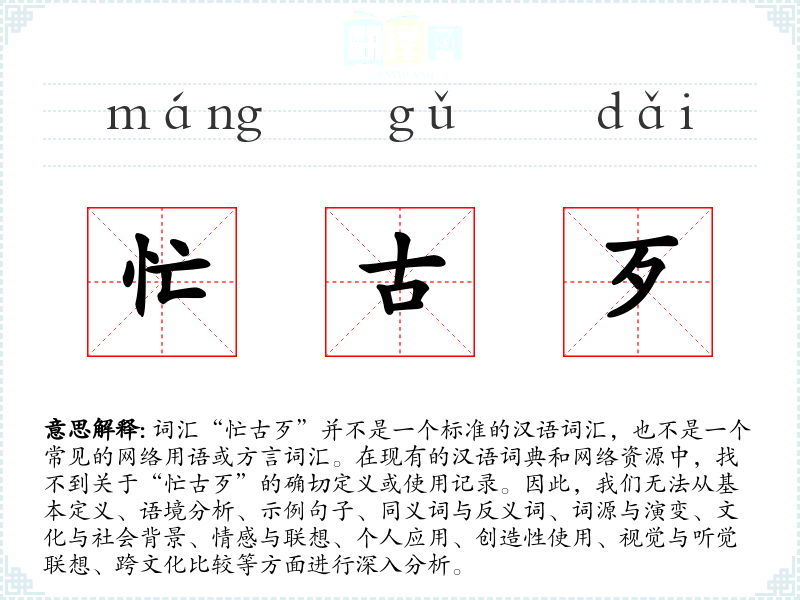 词汇“忙古歹”并不是一个标准的汉语词汇,也不是一个常见的网络用语或方言词汇。在现有的汉语词典和网络资源中,找不到关于“忙古歹”的确切定义或使用记录。因此,我们无法从基本定义、语境分析、示例句子、同义词与反义词、词源与演变、文化与社会背景、情感与联想、个人应用、创造性使用、视觉与听觉联想、跨文化比较等方面进行深入分析。
