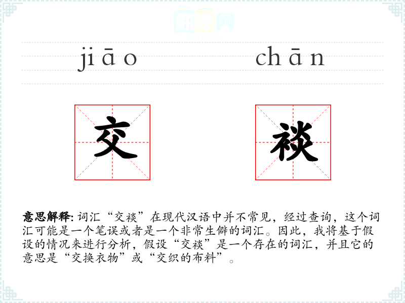 词汇“交裧”在现代汉语中并不常见,经过查询,这个词汇可能是一个笔误或者是一个非常生僻的词汇。因此,我将基于假设的情况来进行分析,假设“交裧”是一个存在的词汇,并且它的意思是“交换衣物”或“交织的布料”。