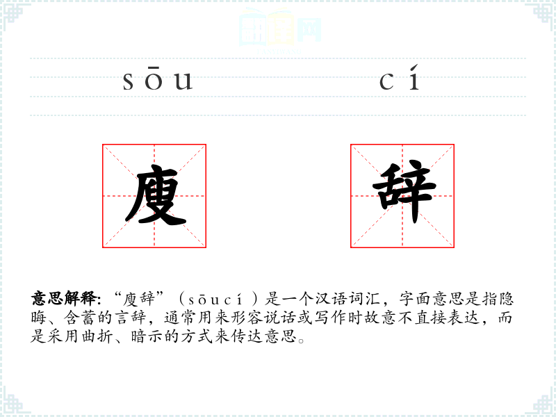 “廋辞”(sōu cí)是一个汉语词汇,字面意思是指隐晦、含蓄的言辞,通常用来形容说话或写作时故意不直接表达,而是采用曲折、暗示的方式来传达意思。