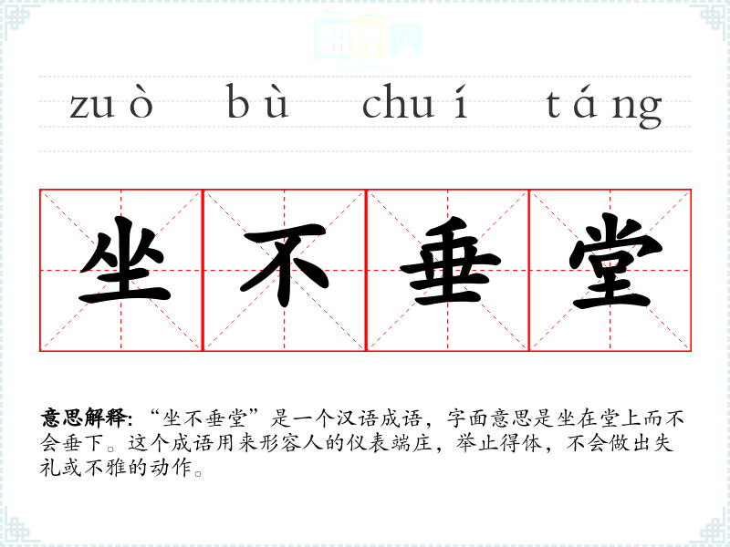 “坐不垂堂”是一个汉语成语,字面意思是坐在堂上而不会垂下。这个成语用来形容人的仪表端庄,举止得体,不会做出失礼或不雅的动作。