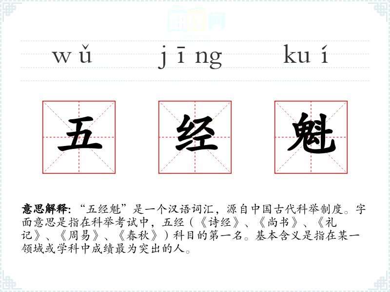 “五经魁”是一个汉语词汇,源自**古代科举制度。字面意思是指在科举考试中,五经(《诗经》、《尚书》、《礼记》、《周易》、《春秋》)科目的第一名。基本含义是指在某一领域或学科中成绩最为突出的人。