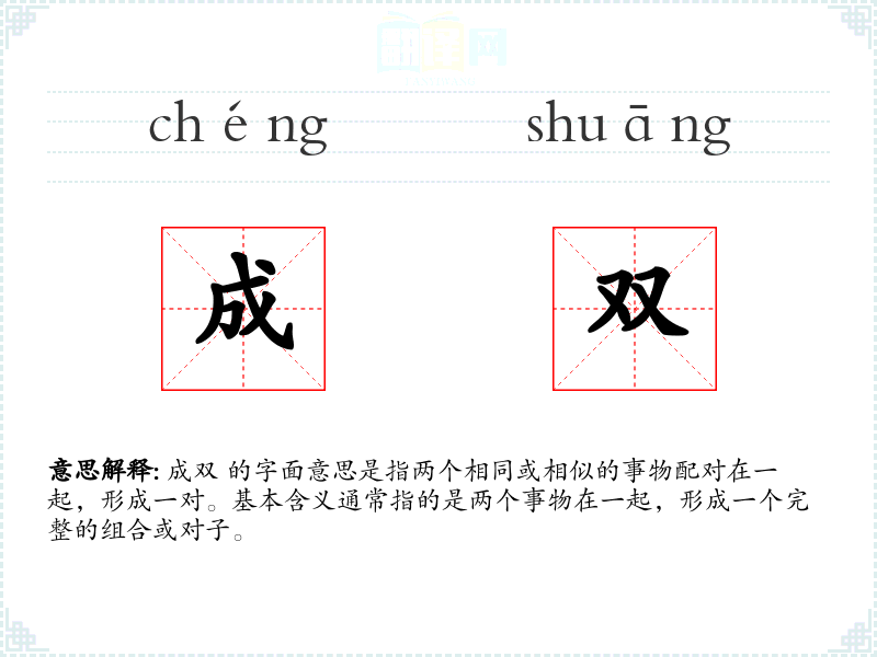 成双 的字面意思是指两个相同或相似的事物配对在一起,形成一对。基本含义通常指的是两个事物在一起,形成一个完整的组合或对子。