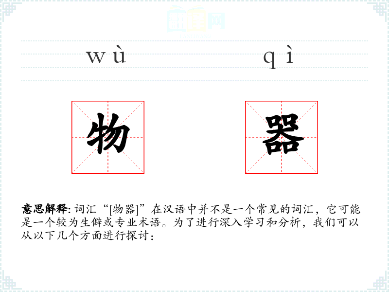词汇“[物器]”在汉语中并不是一个常见的词汇,它可能是一个较为生僻或专业术语。为了进行深入学*和分析,我们可以从以下几个方面进行探讨: