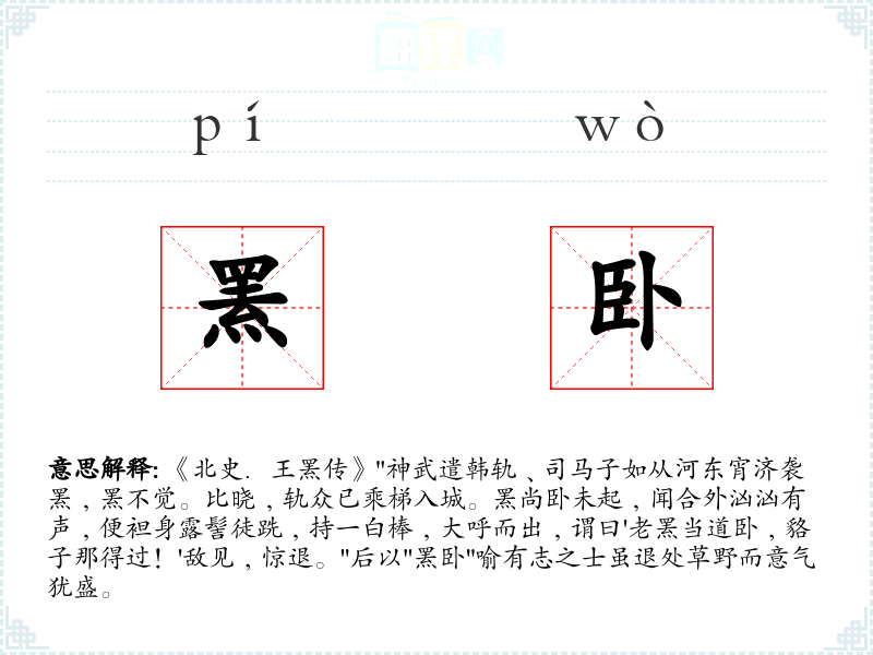 1.《北史.王罴传》"神武遣韩轨﹑司马子如从河东宵济袭罴﹐罴不觉。比晓﹐轨众已乘梯入城。罴尚卧未起﹐闻合外汹汹有声﹐便袒身露髻徒跣﹐持一白棒﹐大呼而出﹐谓曰'老罴当道卧﹐貉子那得过!'敌见﹐惊退。"后以"罴卧"喻有志之士虽退处草野而意气犹盛。