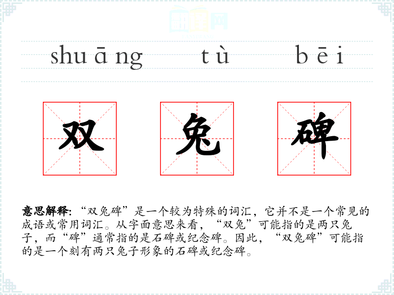 由于“双兔碑”并不是一个常见的词汇,其词源和历史演变可能不太明确。它可能是某个特定地区或文化的产物,随着时间的推移,其意义和使用范围可能有所变化。