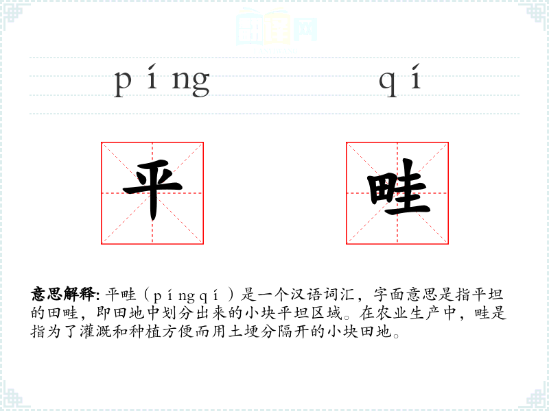 平畦(píng qí)是一个汉语词汇,字面意思是指平坦的田畦,即田地中划分出来的小块平坦区域。在农业生产中,畦是指为了灌溉和种植方便而用土埂分隔开的小块田地。