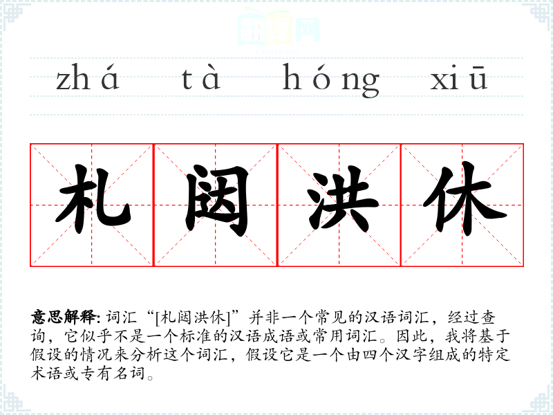 词汇“[札闼洪休]”并非一个常见的汉语词汇,经过查询,它似乎不是一个标准的汉语成语或常用词汇。因此,我将基于假设的情况来分析这个词汇,假设它是一个由四个汉字组成的特定术语或专有名词。
