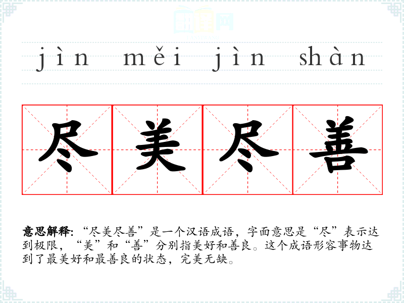 “尽美尽善”是一个汉语成语,字面意思是“尽”表示达到极限,“美”和“善”分别指美好和善良。这个成语形容事物达到了最美好和最善良的状态,完美无缺。