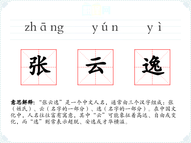 “张云逸”是一个中文人名,通常由三个汉字组成:张(姓氏)、云(名字的一部分)、逸(名字的一部分)。在**文化中,人名往往富有寓意,其中“云”可能象征着高远、自由或变化,而“逸”则常表示超脱、安逸或才华横溢。