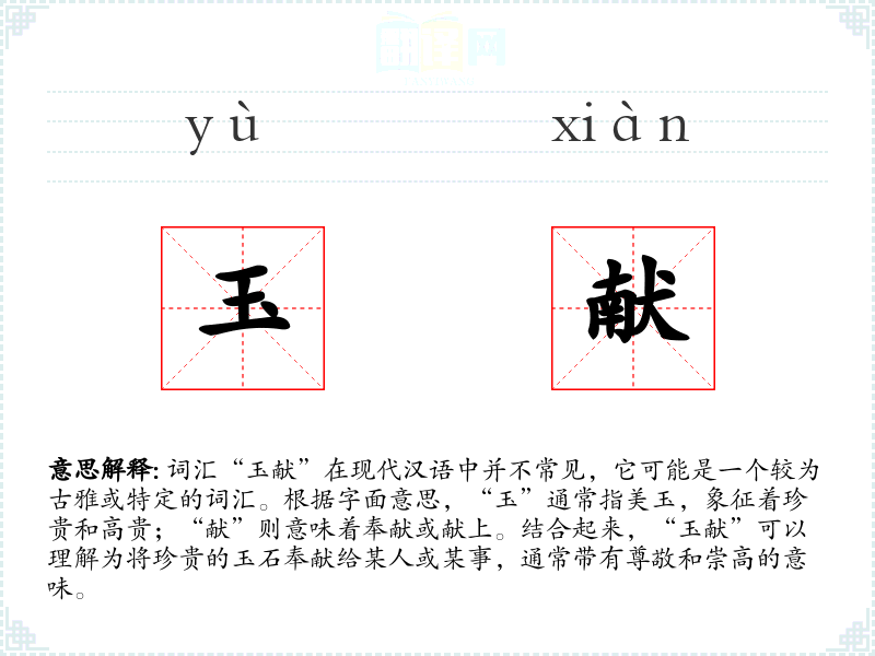 - “玉献”是一个充满文化内涵和历史背景的词汇,虽然在现代汉语中不常见,但它体现了古代礼仪和文化的重要性。在学*和理解这个词汇时,可以更深入地了解**的历史和文化。