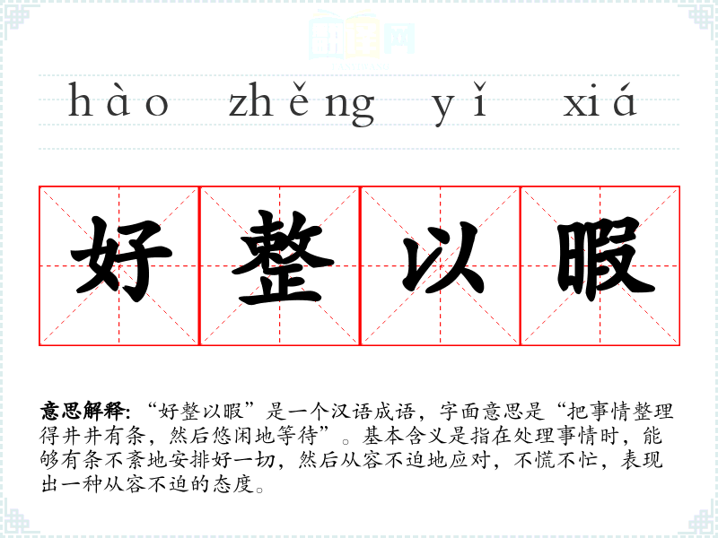 “好整以暇”是一个汉语成语,字面意思是“把事情整理得井井有条,然后悠闲地等待”。基本含义是指在处理事情时,能够有条不紊地安排好一切,然后从容不迫地应对,不慌不忙,表现出一种从容不迫的态度。