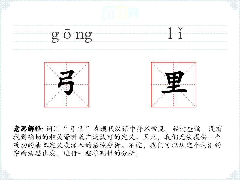 词汇“[弓里]”在现代汉语中并不常见,经过查询,没有找到确切的相关资料或广泛认可的定义。因此,我们无法提供一个确切的基本定义或深入的语境分析。不过,我们可以从这个词汇的字面意思出发,进行一些推测性的分析。
