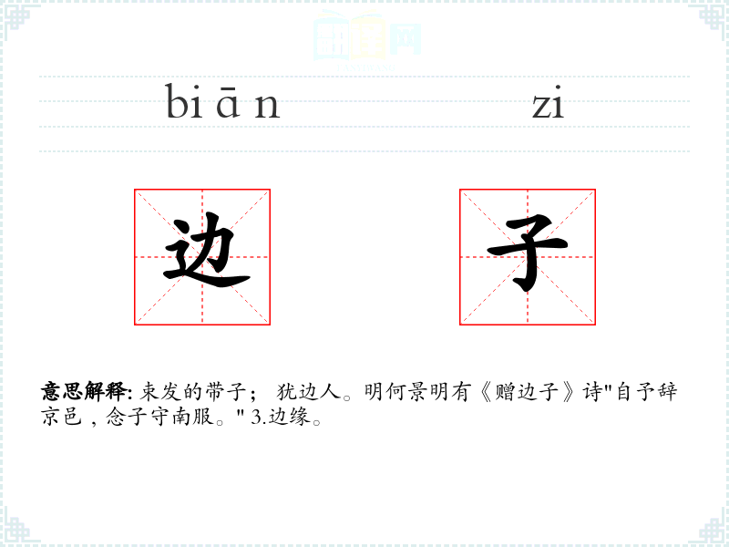 束发的带子; 犹边人。明何景明有《赠边子》诗"自予辞京邑﹐念子守南服。" 3.边缘。
