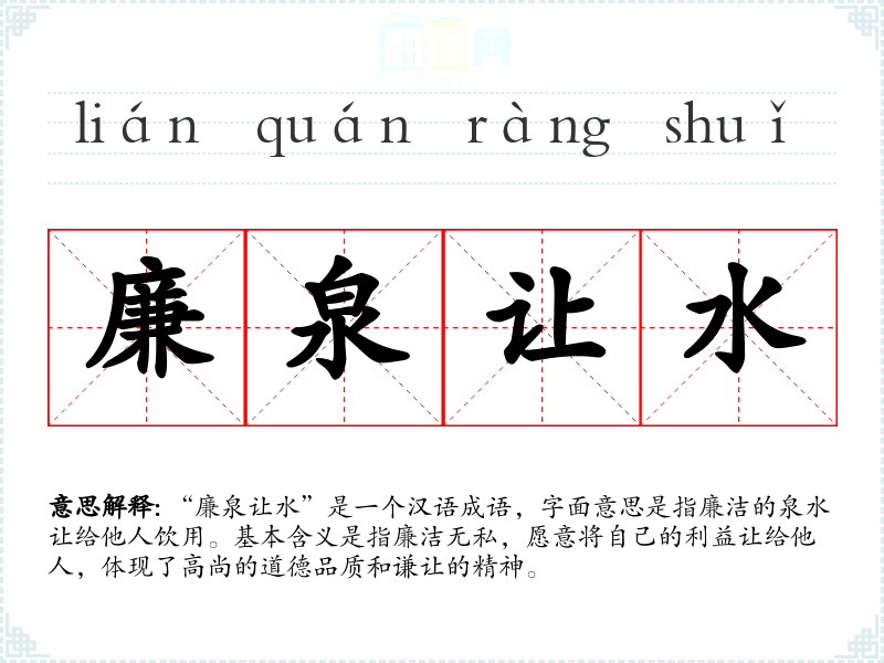“廉泉让水”是一个汉语成语,字面意思是指廉洁的泉水让给他人饮用。基本含义是指廉洁无私,愿意将自己的利益让给他人,体现了高尚的道德品质和谦让的精神。