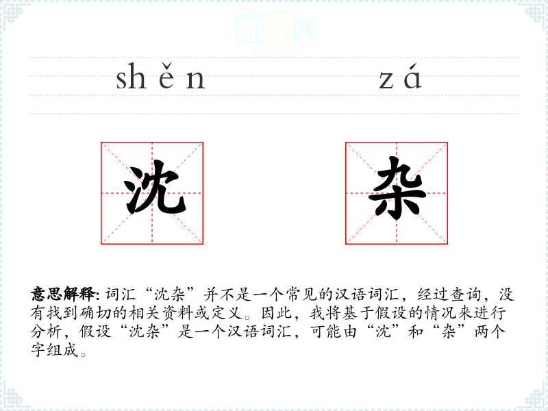词汇“沈杂”并不是一个常见的汉语词汇,经过查询,没有找到确切的相关资料或定义。因此,我将基于假设的情况来进行分析,假设“沈杂”是一个汉语词汇,可能由“沈”和“杂”两个字组成。