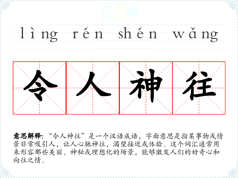 “令人神往”是一个汉语成语,字面意思是指某事物或情景非常吸引人,让人心驰神往,渴望接近或体验。这个词汇通常用来形容那些美丽、神秘或理想化的场景,能够激发人们的好奇心和向往之情。