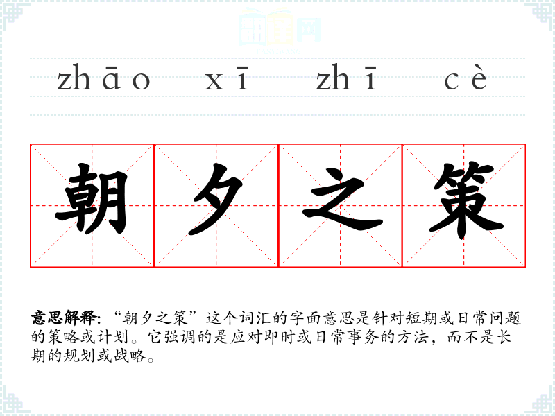 “朝夕之策”这个词汇的字面意思是针对短期或日常问题的策略或计划。它强调的是应对即时或日常事务的方法,而不是长期的规划或战略。
