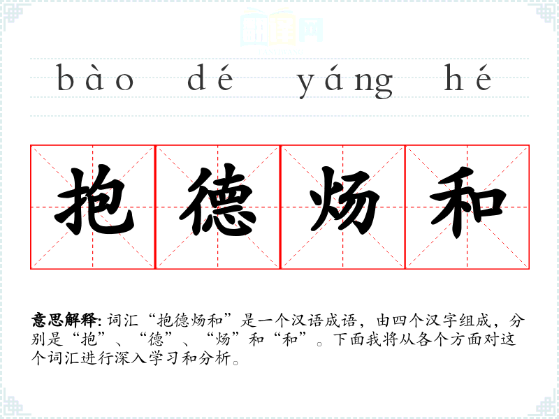 通过以上的分析,我们可以看到“抱德炀和”这个成语在汉语中的丰富内涵和文化价值,它不仅是一个语言符号,也是中华文化中美好品质的象征。