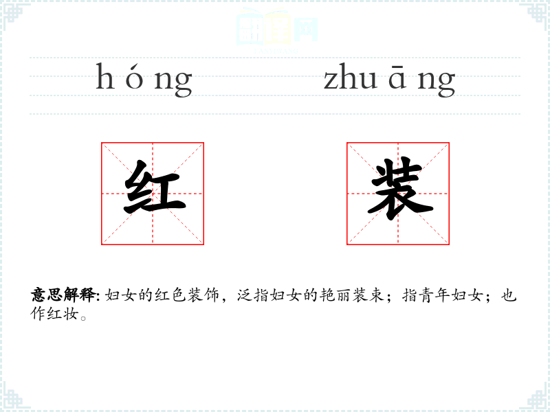 妇女的红色装饰,泛指妇女的艳丽装束;指青年妇女;也作红妆。