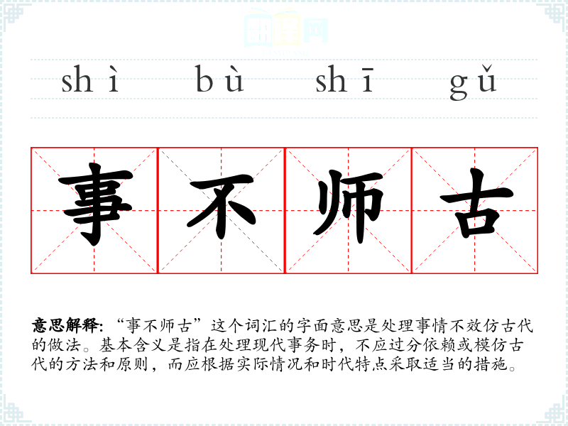 “事不师古”这个词汇的字面意思是处理事情不效仿古代的做法。基本含义是指在处理现代事务时,不应过分依赖或模仿古代的方法和原则,而应根据实际情况和时代特点采取适当的措施。