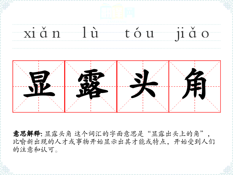 显露头角 这个词汇的字面意思是“显露出头上的角”,比喻新出现的人才或事物开始显示出其才能或特点,开始受到人们的注意和认可。