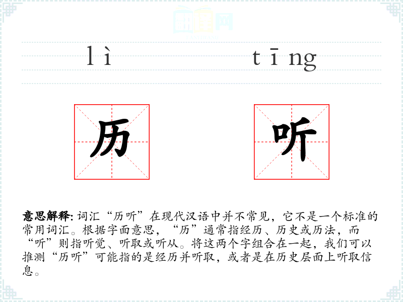 跨文化比较: 由于“历听”不是一个常用词汇,它在不同语言或文化中的对应词汇可能不存在。如果要在其他语言中寻找类似的表达,可能需要创造性地将“历”和“听”的概念结合起来。