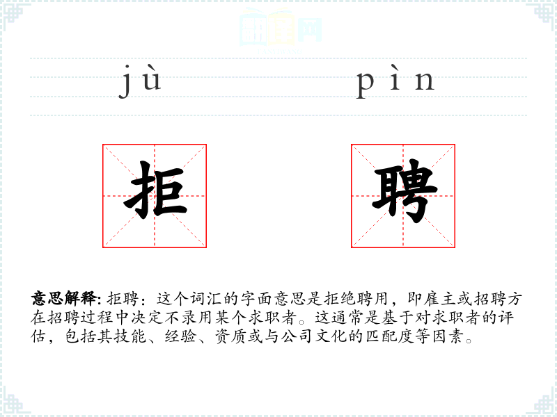 拒聘:这个词汇的字面意思是拒绝聘用,即雇主或招聘方在招聘过程中决定不录用某个求职者。这通常是基于对求职者的评估,包括其技能、经验、资质或与公司文化的匹配度等因素。