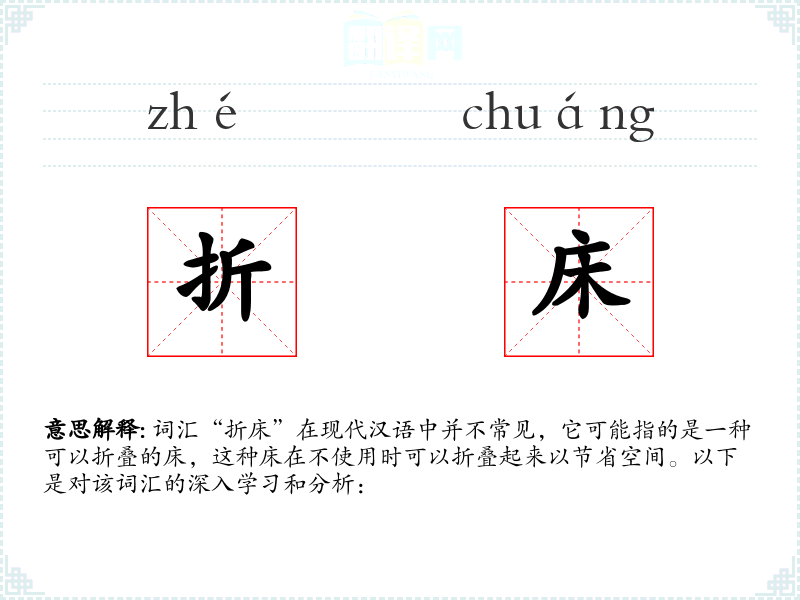 词汇“折床”在现代汉语中并不常见,它可能指的是一种可以折叠的床,这种床在不使用时可以折叠起来以节省空间。以下是对该词汇的深入学习和分析: