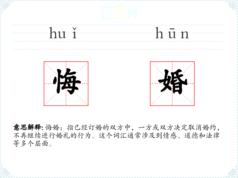 悔婚:指已经订婚的双方中,一方或双方决定取消婚约,不再继续进行婚礼的行为。这个词汇通常涉及到情感、道德和法律等多个层面。