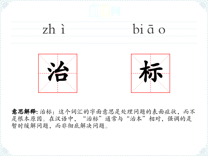 治标:这个词汇的字面意思是处理问题的表面症状,而不是根本原因。在汉语中,“治标”通常与“治本”相对,强调的是暂时缓解问题,而非彻底解决问题。