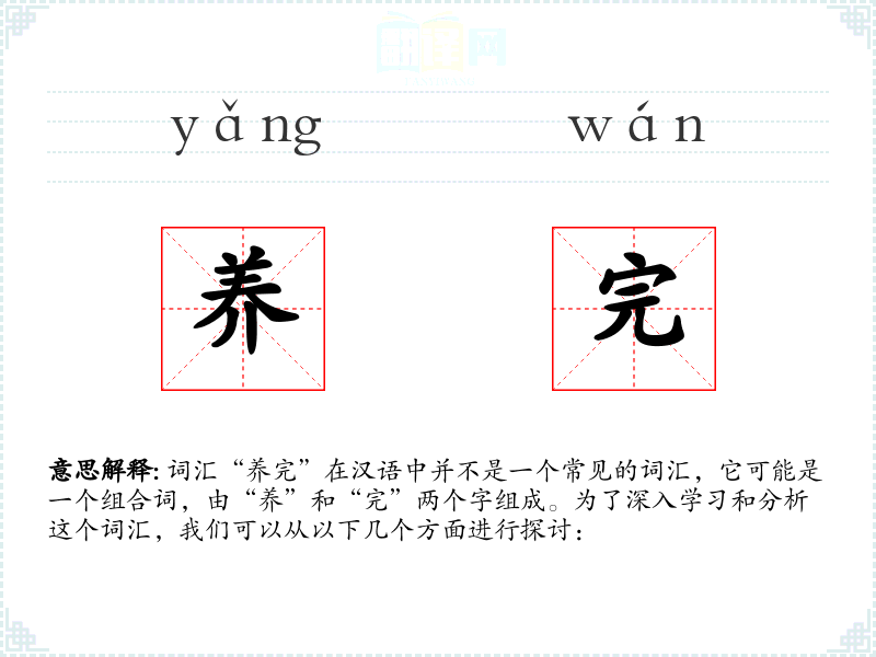 词汇“养完”在汉语中并不是一个常见的词汇,它可能是一个组合词,由“养”和“完”两个字组成。为了深入学*和分析这个词汇,我们可以从以下几个方面进行探讨: