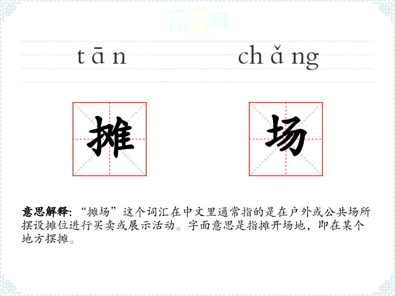 “摊场”这个词汇在中文里通常指的是在户外或公共场所摆设摊位进行买卖或展示活动。字面意思是指摊开场地,即在某个地方摆摊。