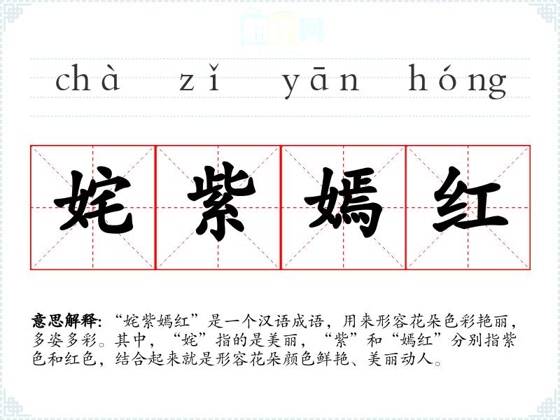 “姹紫嫣红”是一个汉语成语,用来形容花朵色彩艳丽,多姿多彩。其中,“姹”指的是美丽,“紫”和“嫣红”分别指紫色和红色,结合起来就是形容花朵颜色鲜艳、美丽动人。