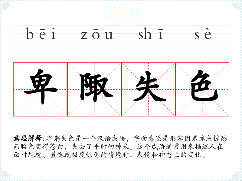 卑躬失色是一个汉语成语,字面意思是形容因羞愧或惊恐而脸色变得苍白,失去了平时的神采。这个成语通常用来描述人在面对尴尬、羞愧或极度惊恐的情境时,表情和神态上的变化。