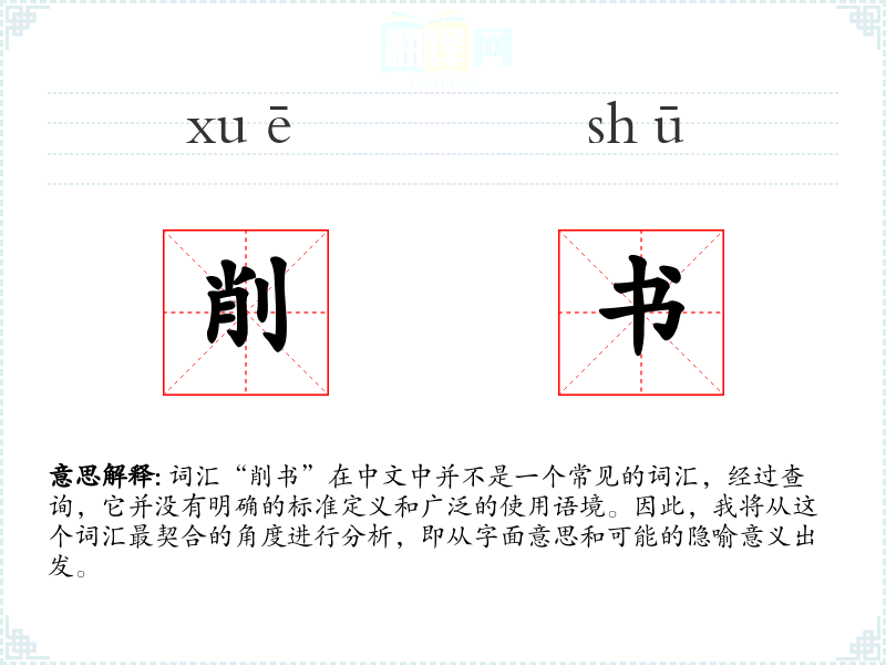 “削书”字面意思可能是指削减书籍的内容,或者是对书籍进行某种形式的修剪或编辑。然而,这个词汇在中文中并不常见,也没有明确的定义。