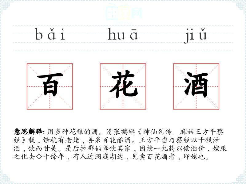 1.用多种花酿的酒。清张鹤辑《神仙列传.麻姑王方平蔡经》载﹐馀杭有老姥﹐善采百花酿酒。王方平尝与蔡经以千钱沽酒﹐饮而甘美。是后拉群仙降饮其家﹐因授一丸药以偿酒价﹐姥服之化去◇十馀年﹐有人过洞庭湖边﹐见卖百花酒者﹐即姥也。