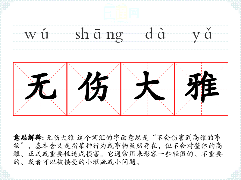 无伤大雅 这个词汇的字面意思是“不会伤害到高雅的事物”,基本含义是指某种行为或事物虽然存在,但不会对整体的高雅、正式或重要性造成损害。它通常用来形容一些轻微的、不重要的、或者可以被接受的小瑕疵或小问题。