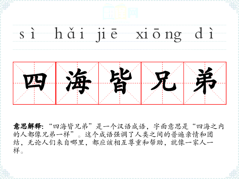“四海皆兄弟”是一个汉语成语,字面意思是“四海之内的人都像兄弟一样”。这个成语强调了人类之间的普遍亲情和团结,无论人们来自哪里,都应该相互尊重和帮助,就像一家人一样。