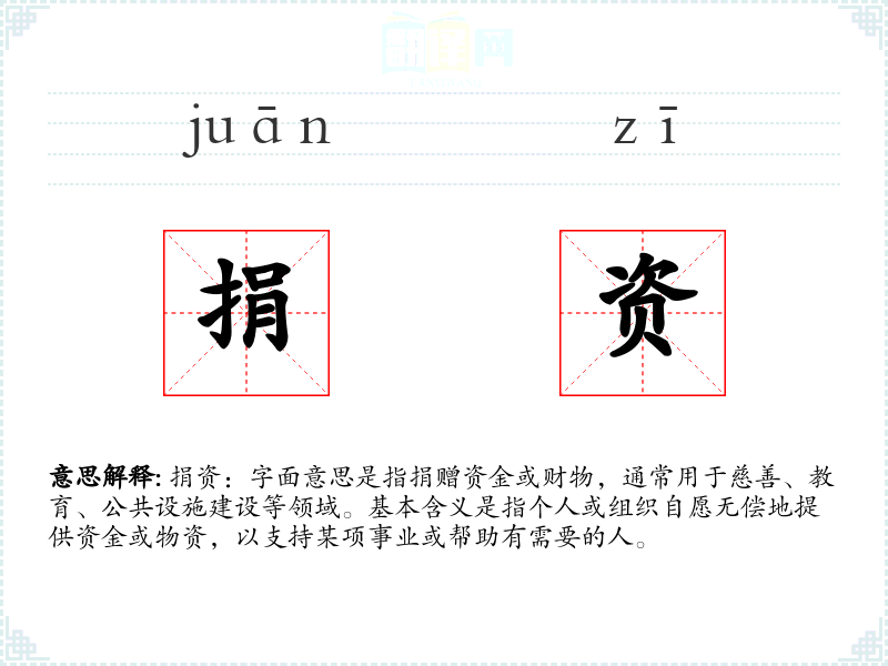 词源:“捐”字古已有之,意为舍弃、放弃;“资”字意为资金、财物。两者结合,形成了现代汉语中的“捐资”。
