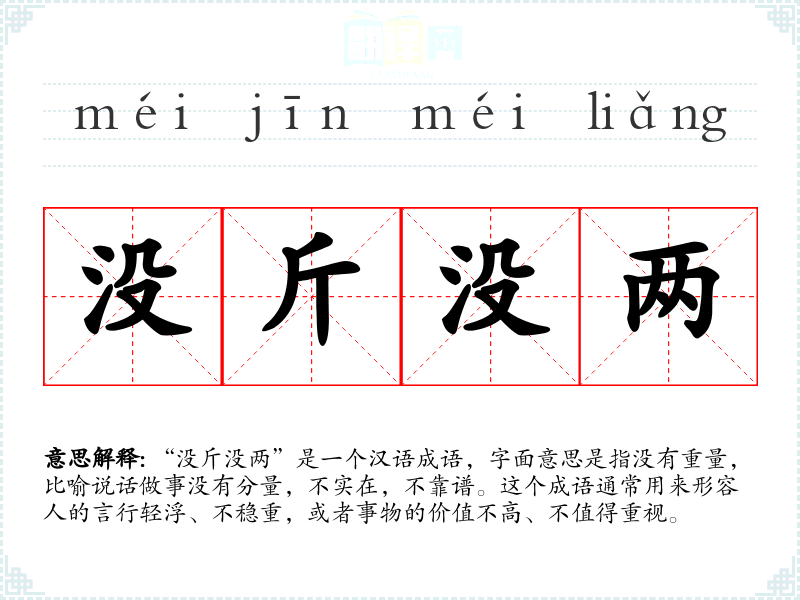“没斤没两”是一个汉语成语,字面意思是指没有重量,比喻说话做事没有分量,不实在,不靠谱。这个成语通常用来形容人的言行轻浮、不稳重,或者事物的价值不高、不值得重视。