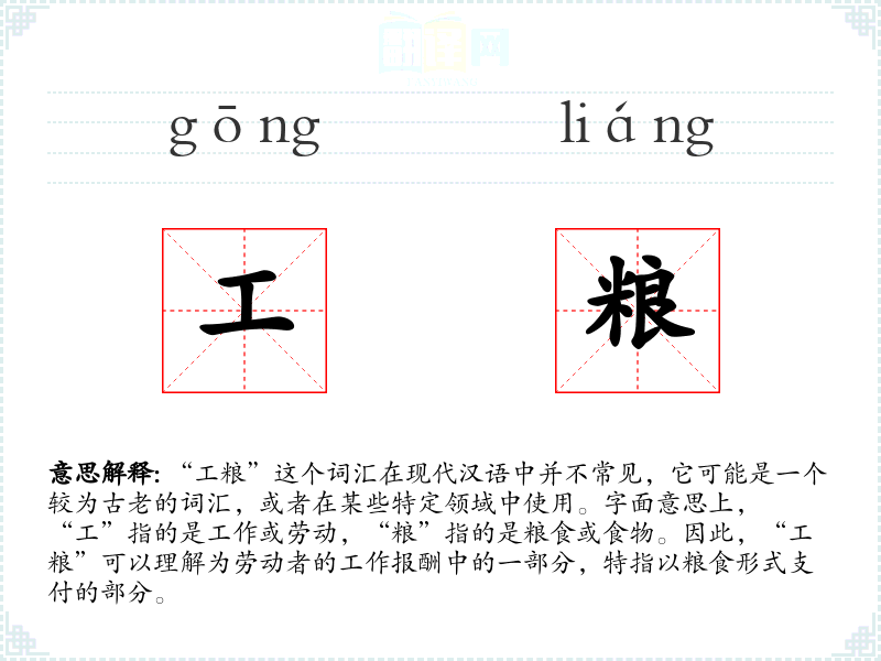 - 反义词:薪水、工资(这些是现代以货币形式支付的报酬,与实物形式的“工粮”相对)